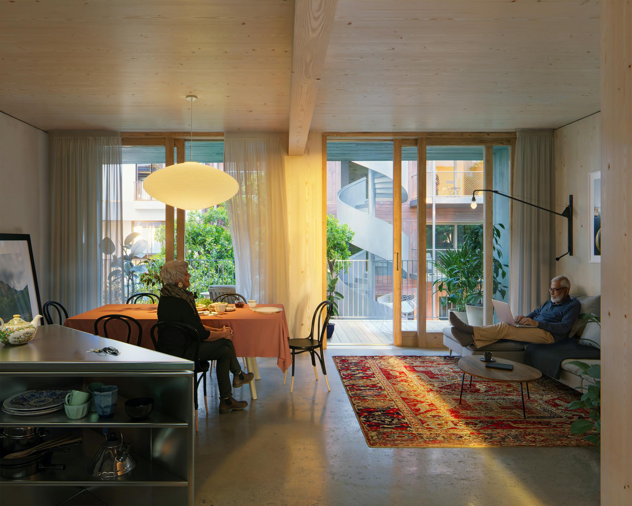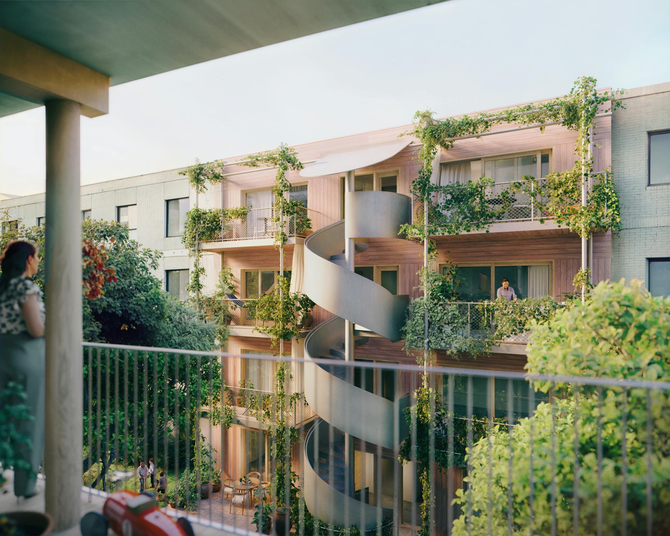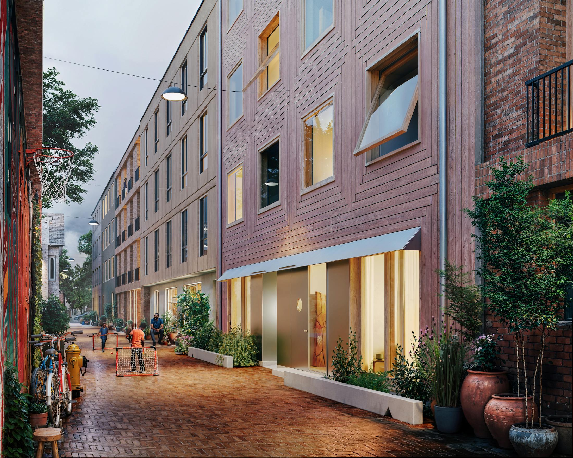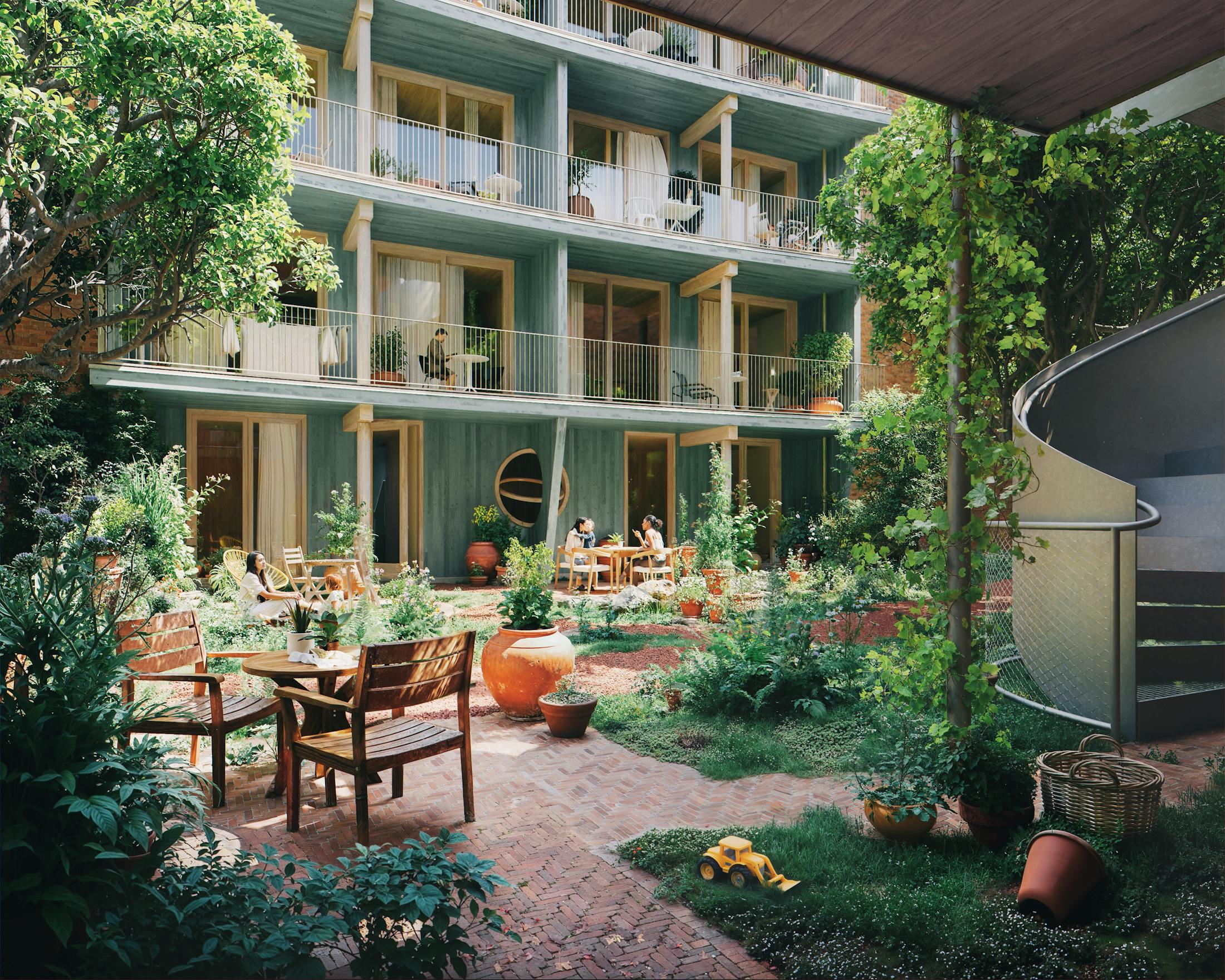 The courtyard-block typology accommodates a range of apartment types, from studios to three- or four-bedrooms, for flexibility over a life cycle. A resident could move apartments several times over their lifetime as their circumstances change and never leave their street.